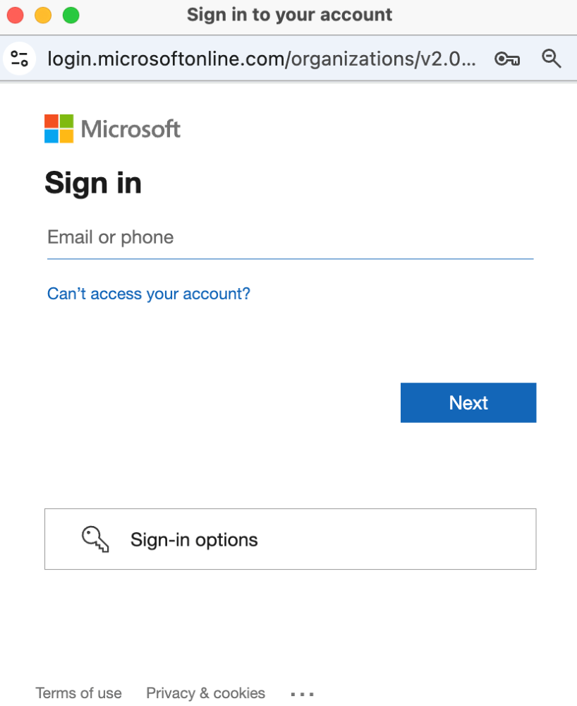 5. Enter OneDrive or Microsoft Office 365 login credentials and click Next.