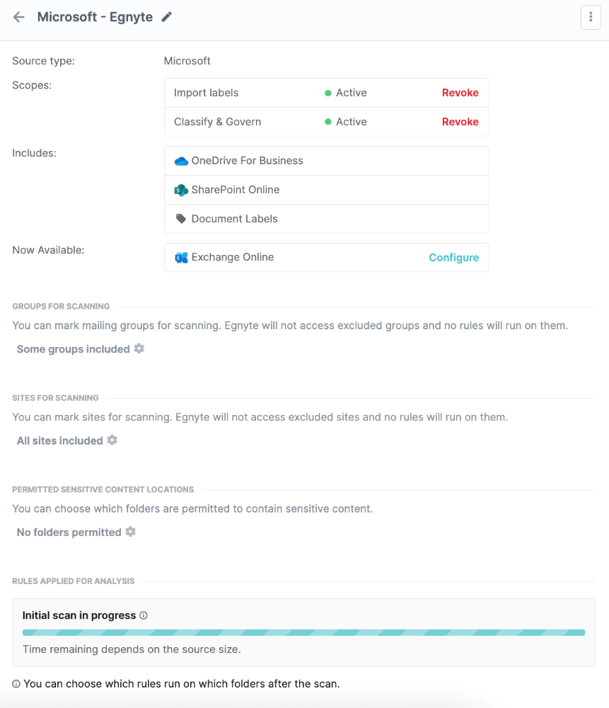 Egnyte Secure & Govern allows the classification of content from emails and attachments within the Exchange Online server. Users can set up access to Exchange Online by adding Microsoft/Office 365 as a source and completing an additional optional step.