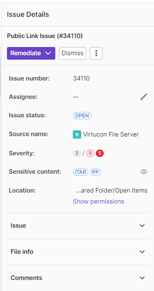 Each issue is assigned a Severity score based on the issue type and the nature of the item to which the issue pertains. For instance, an Unused Group issue has a severity of 1, whereas a Public Link issue that concerns a file with sensitive content may have a severity of 9. The user can sort by issue severity to quickly review and triage the most important issues.