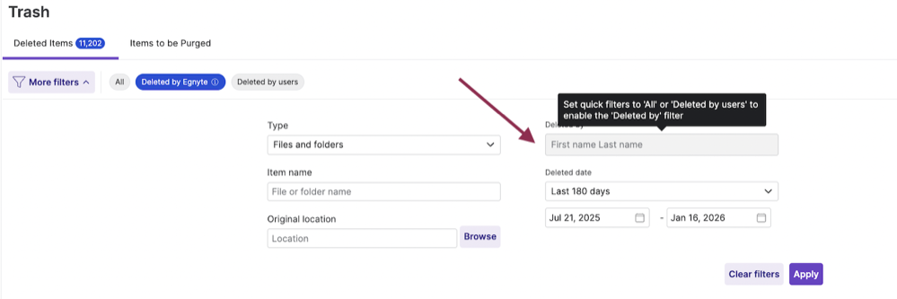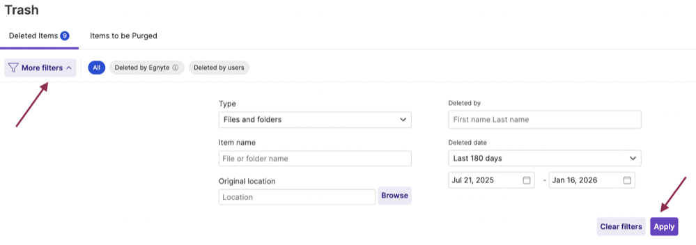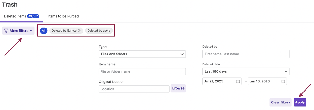 Users can click on More filters, select the desired filter(s), and click on Apply. Egnyte’s trash filter tool lets the users filter with the following fields.