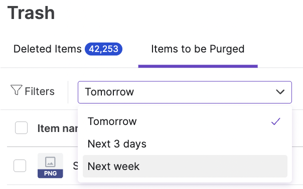 Admins have the option to filter and view the list of items scheduled for purging tomorrow, within the next 3 days, or next week.