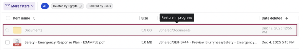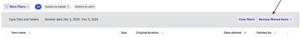 - Deleted by Egnyte will show the items deleted by Egnyte going forward. Items that are already deleted will not be treated as system deleted and hence, will not appear under this filter.