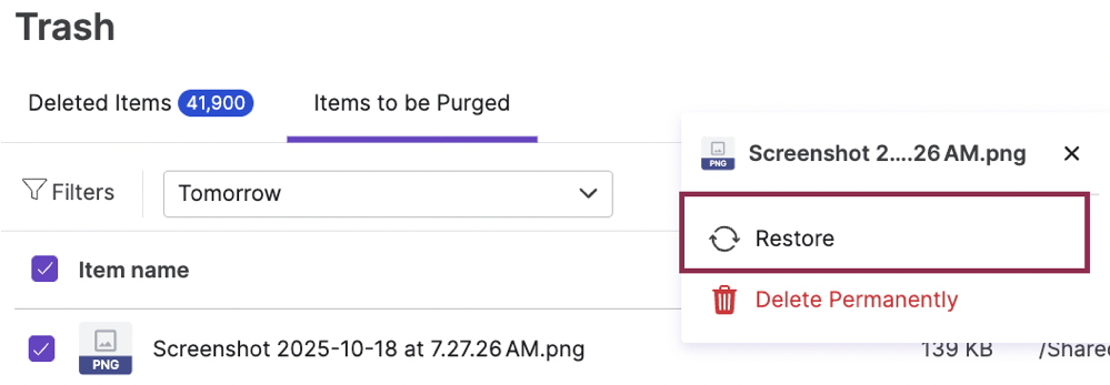 Admins can select and restore purgeable items by navigating to the Items to be Purged tab. Select the items to restore and click on Restore option.