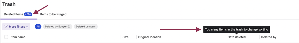 If the deleted items are more than 50,000, the count appears as >50k. The sort option is unavailable for performance and scalability reasons when the number of items in the trash exceeds 50,000 items.
