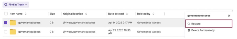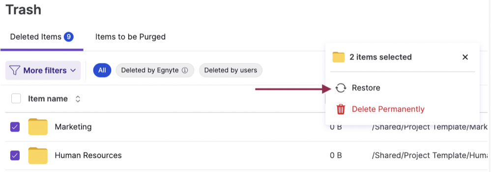 Administrators have the capability to enable this function for Power Users. If there are access issues concerning the Trash folder, contact an Administrator for assistance. Learn more about the Trash and Retention Policy Settings in Egnyte.
