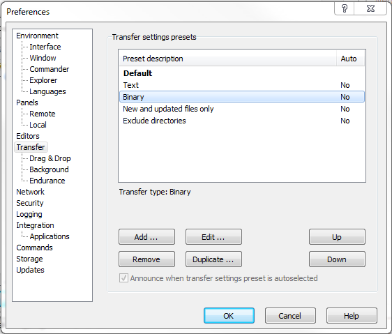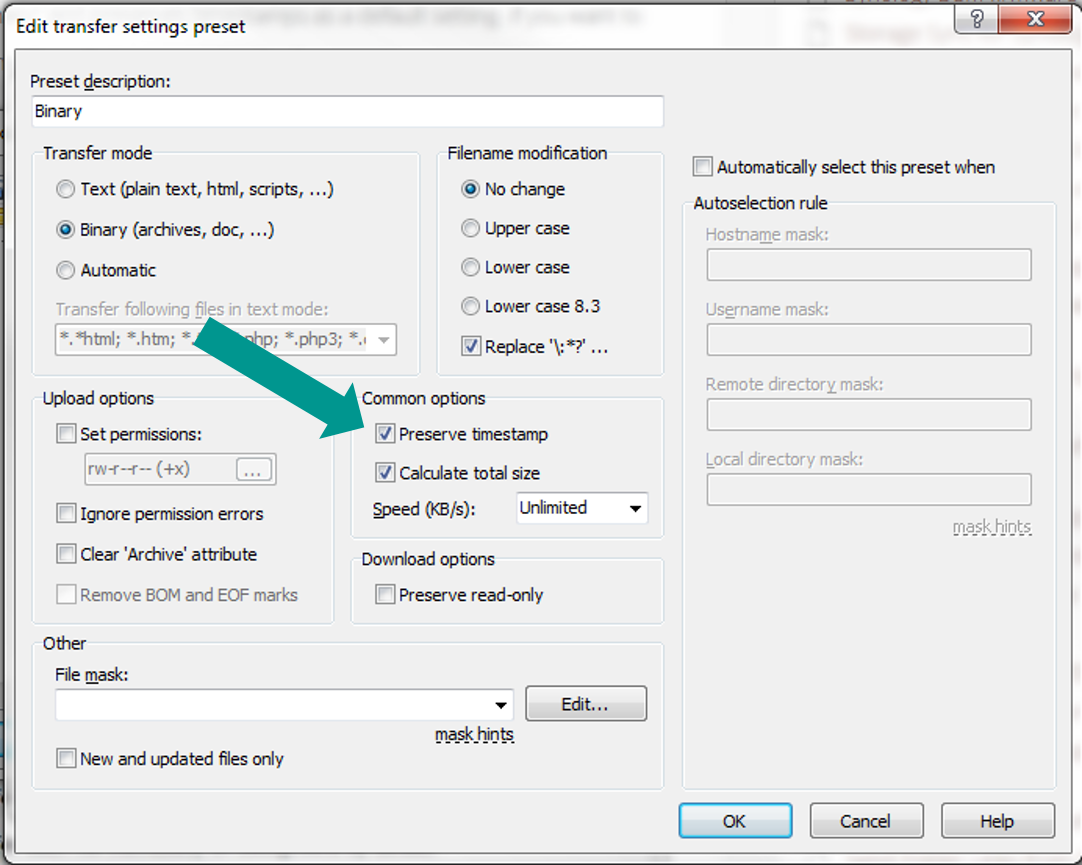 When you're done setting up this page, it might look like this: - WinSCP maintains transfer mode as binary and preserves timestamps as a default setting. If you want to change them, you can do so from within the Transfer menu (go to Tools, then Preferences).