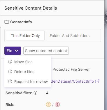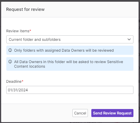 The ability to request reviews of sensitive content locations has been added to the Secure & Govern Sensitive Content view. A review request can be sent to Data Owners assigned to a specific location.