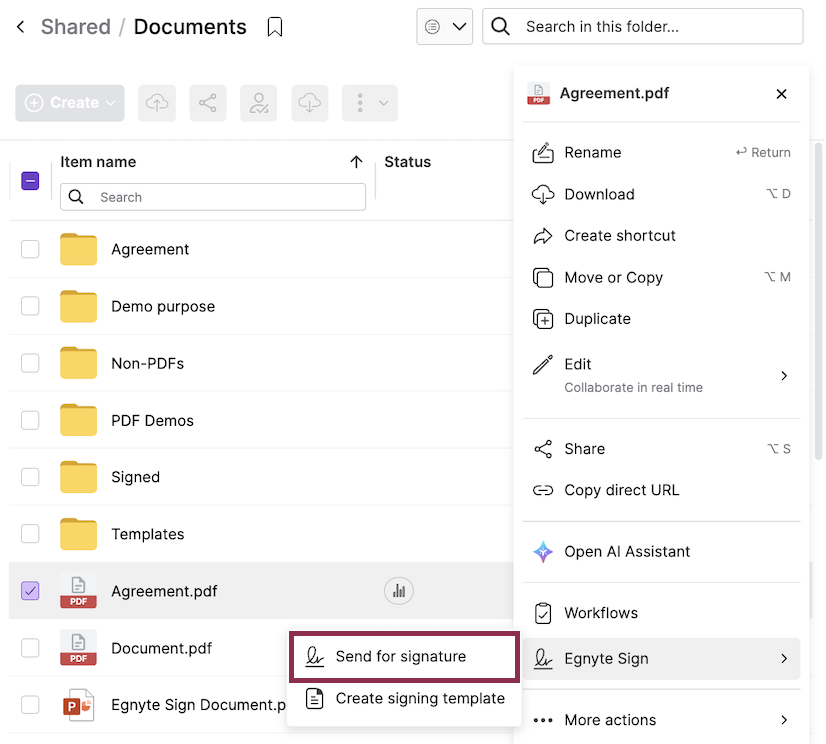 2. Click Egnyte Sign -> Send for signature in the context menu.