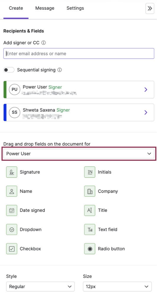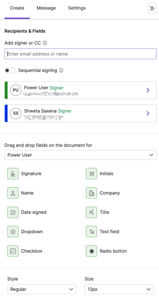 6. Add one or more signers. User can send requests to both domain users and anyone else with an email address.  When adding multiple signers, choose whether they should sign in parallel (the default) or sequentially. To sign sequentially, enable the Sequential Signing toggle and then drag and drop the signers in the desired order.