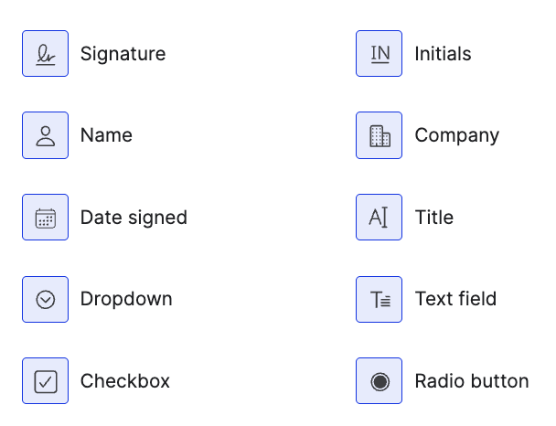 • The user has the option to add fields such as Signature, Initials, Name, Company, Date Signed, Title, Dropdown, Text field, Checkbox, and Radio Button to the document.