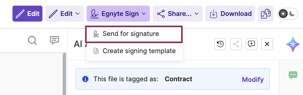 Alternatively, signature requests can be sent from Quick View. Users can click on the Egnyte Sign icon and select Send for Signature from the dropdown menu.