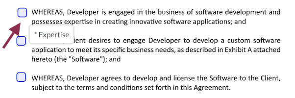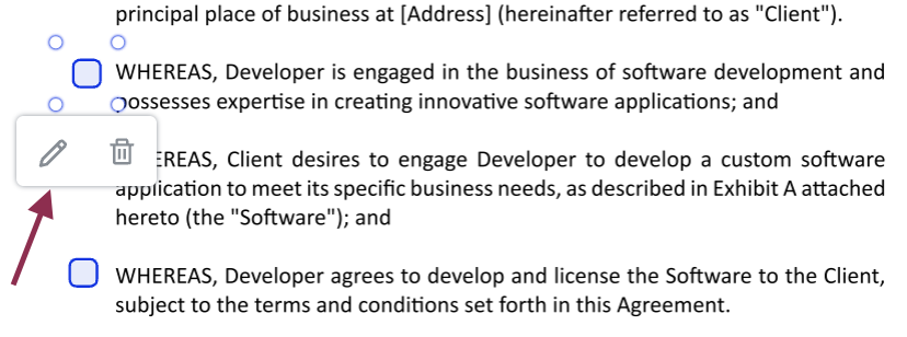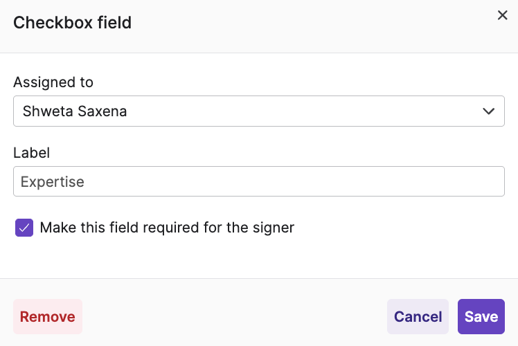• Requestors can add one or multiple checkboxes to the signature request and they can click on the Edit icon to provide a label to the checkbox or to mark the field as mandatory or optional. They can click on the Delete icon to delete the checkbox.