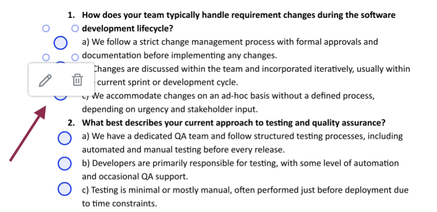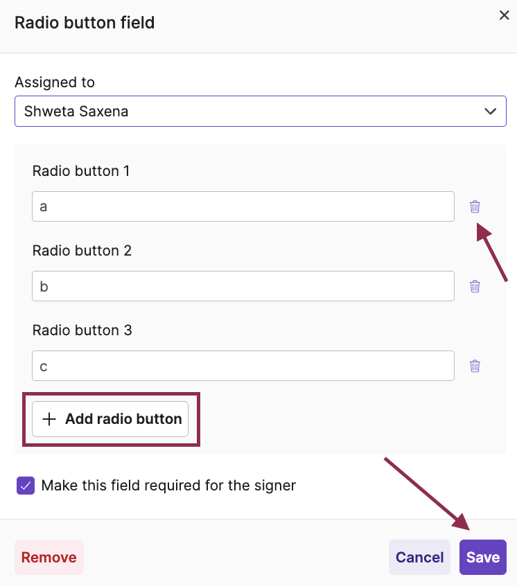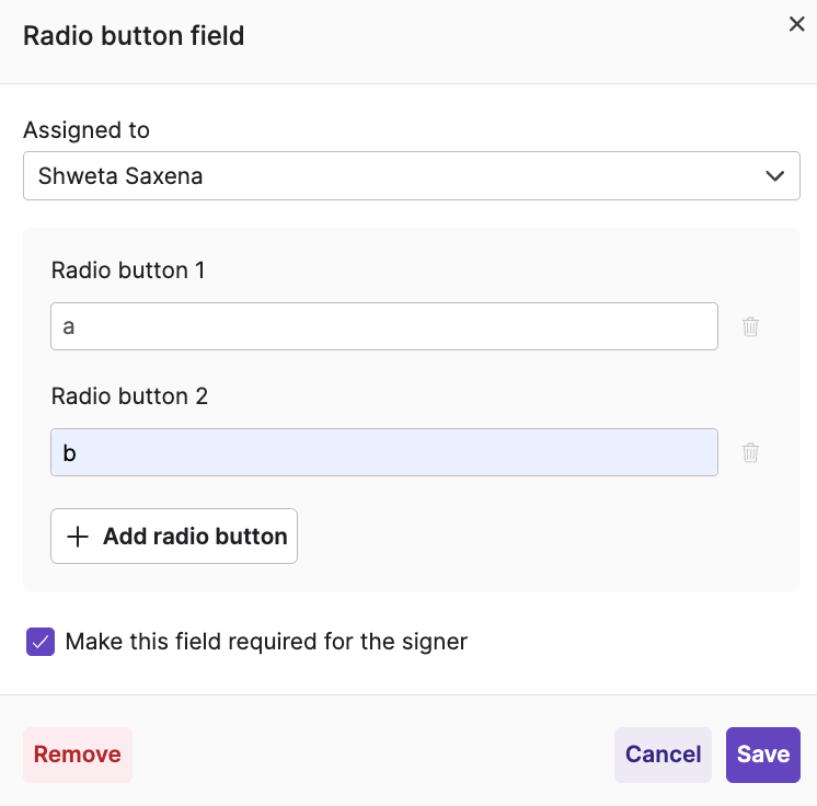 • Egnyte also allows requestors to add radio button groups to a signature request. Recipients can select only one option within each group. Requestors can add multiple radio button groups to a document as needed. They can use the Edit icon to assign a label to each of the radio buttons in the group and to mark the field as mandatory or optional. The Delete icon can be used to remove a radio button group.