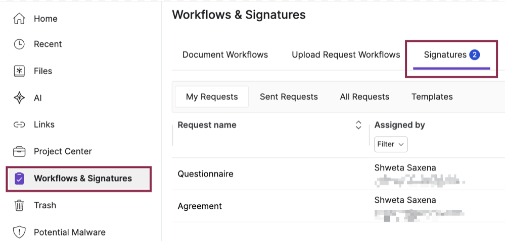 The Signatures dashboard allows you to track the status of your active and completed signature requests.