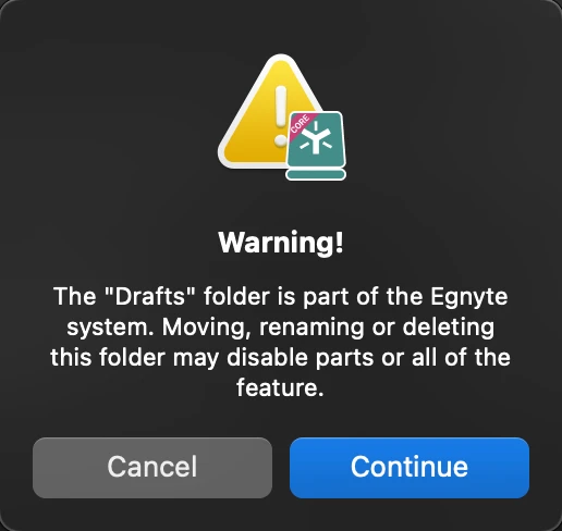 Following the recent release of the Create a Document functionality, which includes a Draft mode, we have implemented a specific warning for actions that may delete the Drafts folder from the Private directory. Whenever a user tries to move, rename, or delete a folder named Drafts in their Private directory, the warning will be displayed as shown below. If users continue, the Publish functionality will be disabled for the documents inside the Drafts folder.