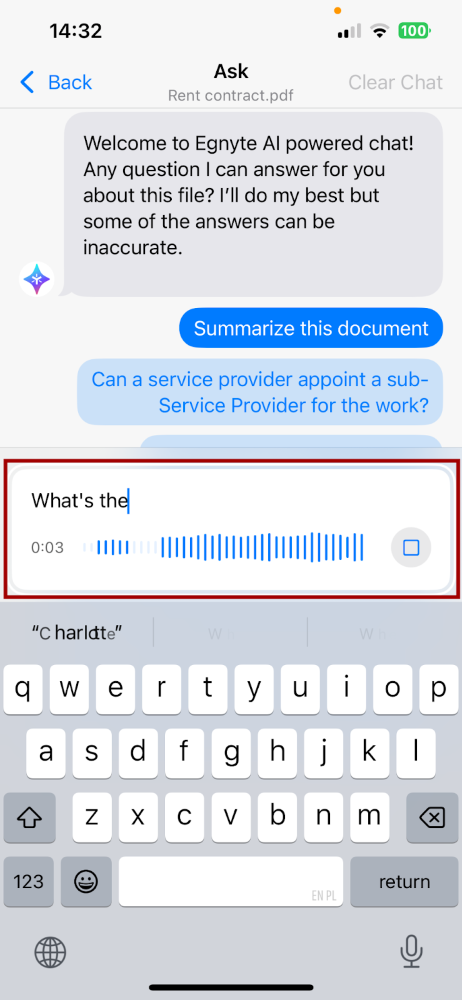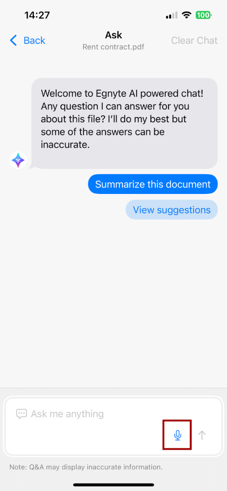 AI-Driven Document Summarization & Document Q&A is available to users who have version 8.27 (or higher) of the Egnyte iOS App. The most up to date version of the Egnyte app is available in the Apple App Store.