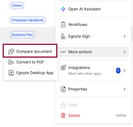 Egnyte offers a file comparison feature, allowing users to compare a file with its previous versions or with a different file altogether. This functionality highlights the differences between the two documents, making it easier for users to track changes, ensure accuracy, and maintain consistency across document versions.