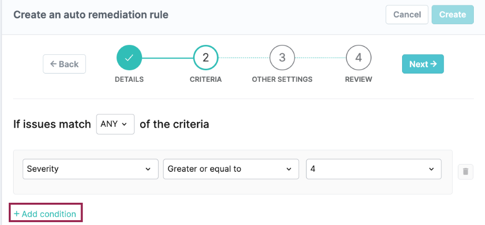 When ALL is selected, all the rule conditions must be met for an issue to be auto-remediated. When ANY is selected, auto-remediation will occur when any of the rule conditions are met.