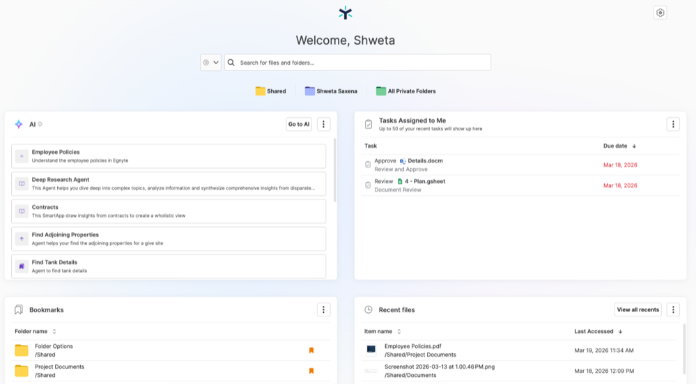 Egnyte’s AI Assistant is an AI-powered assistant that helps users boost productivity by delivering relevant information at their fingertips. Users can interact by asking questions via text or voice, explore suggested prompts, and receive instant, relevant responses.
