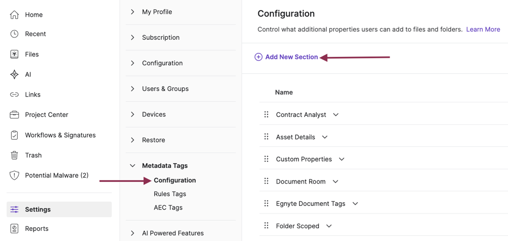 - Navigate to Settings -> Metadata Tags -> Configuration. Click on Add New Section.