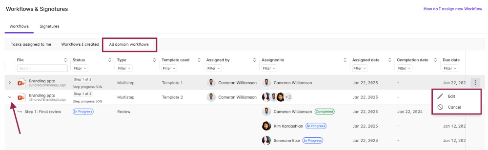 Workflow creators can expand a workflow by clicking the caret to the left of the file type icon.  Expanded workflows show the workflow steps, assignees, and status.