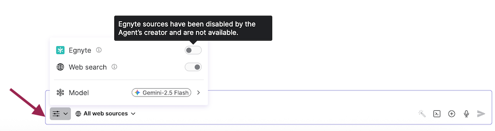 Web Search: Egnyte ensures that data privacy and security are protected at all times when Egnyte and/or Web Search is selected as the source. Learn more about Egnyte’s Generative AI policy. Users can choose to have the information available on the web as a source by turning this toggle on. They can choose All or selected web source(s) by selecting the desired option.