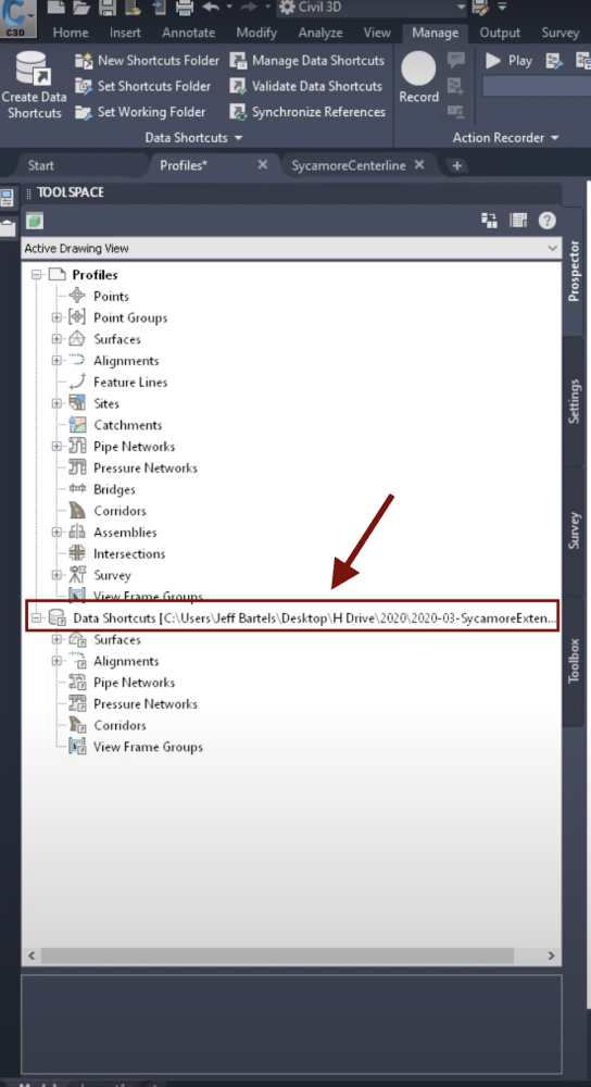 To view and manage the data shortcuts in Civil 3D, open the Prospector tab of Toolspace. Specifically, the Data Shortcuts node, under the Prospector tab, displays the path to the active project and the data shortcuts stored within it.
