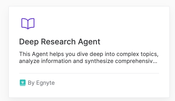The agent can draw from Egnyte content and web sources to carry out in-depth research on a chosen subject. It is well-suited for creating research reports, summarizing market trends, or finding similar documents.