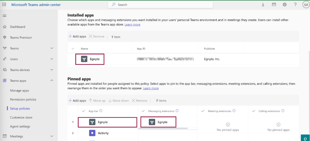 In Teams, admins can pin the Egnyte Personal tab during the setup so that it is visible to all users. However, if the admin does not enable the tab, users can individually perform the action.
