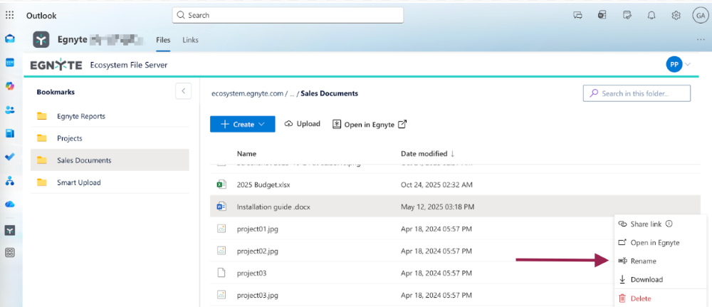 - Rename gives the ability to rename a file or a folder directly in the Egnyte Tab or Personal Tab. All the changes will be automatically synced with Egnyte.