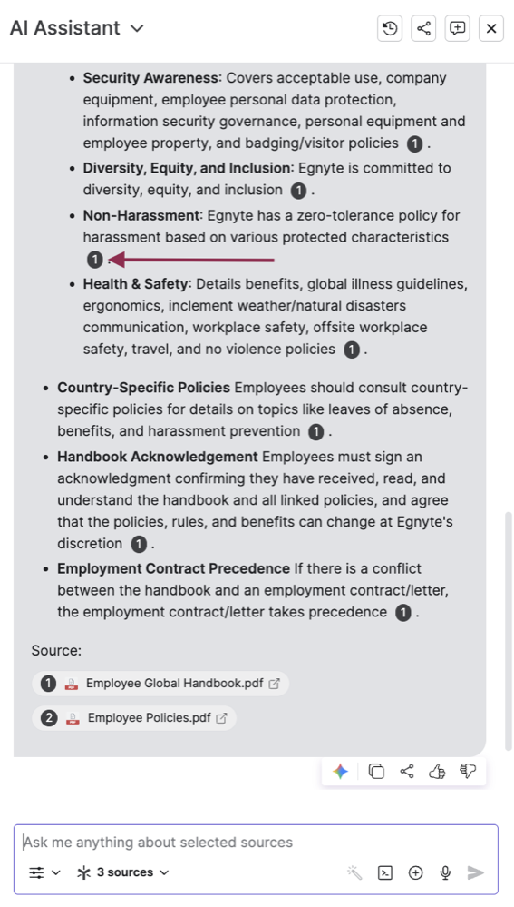 Egnyte has enhanced how citations appear in Egnyte's AI Assistant and Knowledge Bases. Citations now appear inline, directly alongside the referenced text. Users can hover over a citation to view the source file, or click it to open the specific section in the Egnyte document or the web source. Each citation number also links to a detailed source list at the bottom of the response. The same number may appear multiple times indicating that multiple pieces of information were drawn from that single, consistent source document.