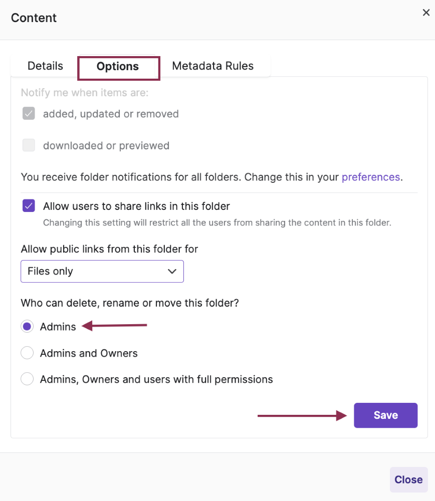 The option to delete, move, or rename a particular folder can now be restricted to Admins only. This provides organizations with strict compliance and security requirements and greater control over the structural changes to their file system. By limiting these actions to Admins, organizations can prevent accidental changes, maintain structural integrity, and ensure that folder structures remain consistent with internal policies.