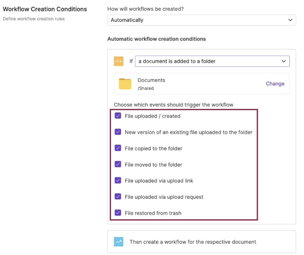 By default, all of these options will be enabled, but users can optionally uncheck one or more events to restrict triggering. Users are required to select at least one event when setting up a trigger, giving workflow creators much greater control over their automation based on precise business processes.