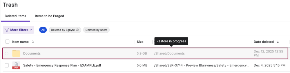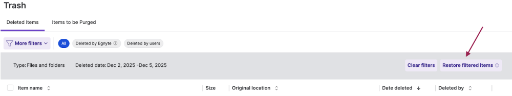 Admins can now restore all filtered items from Trash in a single action using the Restore filtered items option. This bulk-restore capability saves time, reduces manual effort, and makes it easier for users to quickly recover multiple files or folders without restoring them one by one.