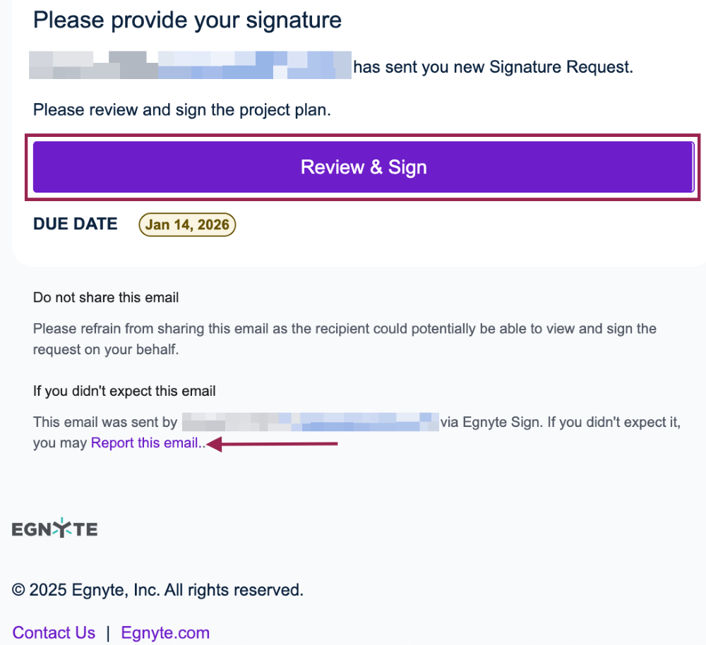 The e-mails also now include a Report this email link, allowing users to quickly notify the Egnyte Security team using a pre-populated template. This helps strengthen spam and phishing prevention, ensures faster reporting of suspicious activity.