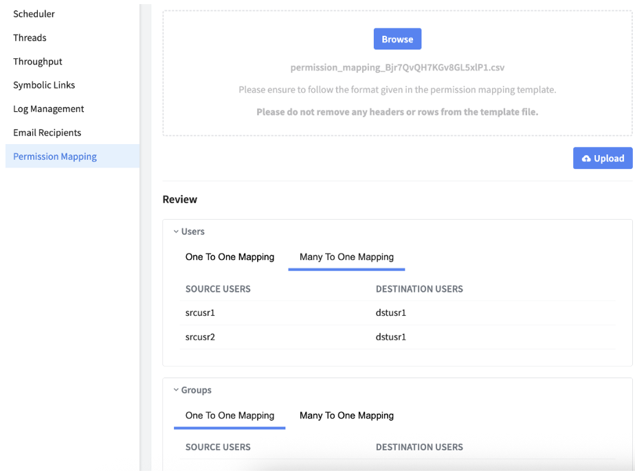 Users can now upload a single CSV file for one-on-one and many-to-one permissions mappings instead of two different files. This makes the user permission mapping simpler and minimizes the chances of errors or mismatches during bulk permission updates.