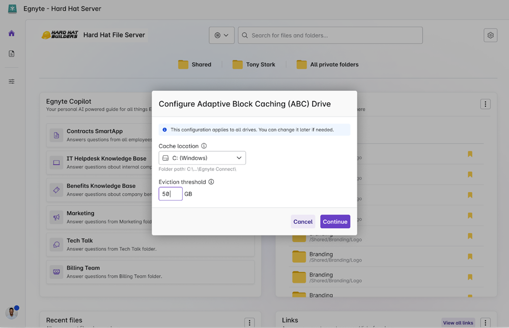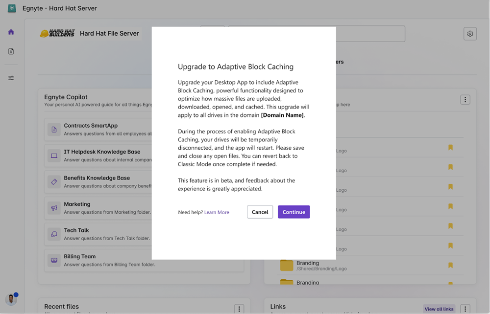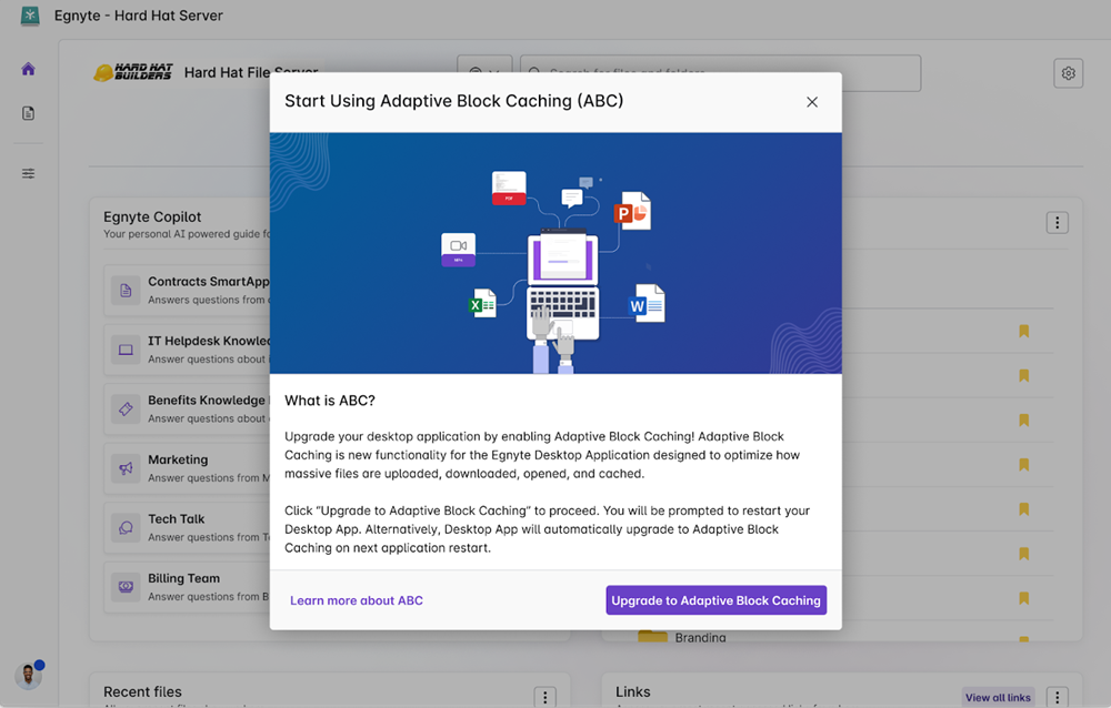 Adaptive Block Caching (ABC) is a next-generation caching technology built into the Egnyte Desktop App, designed to transform how teams work with large and complex files by intelligently streaming and syncing only what is necessary for a given period of time. This means faster file access, smoother performance, and a more responsive experience.
