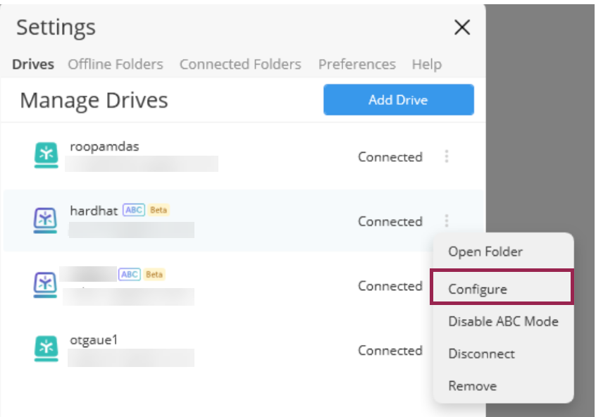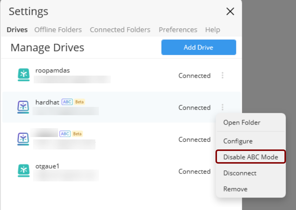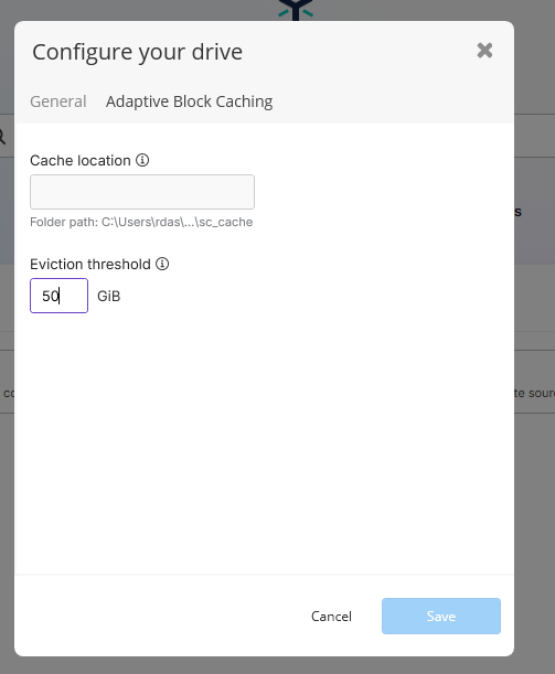 - For any additional ABC drives (for example, multiple domains or users on the same device), the cache location is reused and fixed, but each drive’s eviction threshold can still be configured separately. Existing ABC drives can adjust the threshold later via a Settings> three dots menu on the drive > Configure > Adaptive Block Caching tab in the Desktop App.