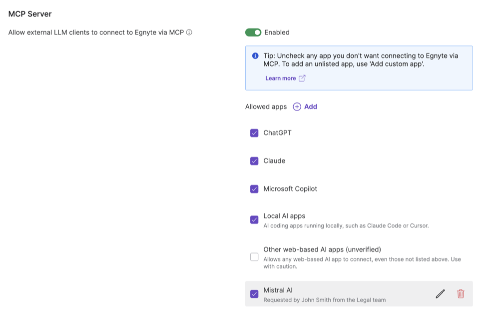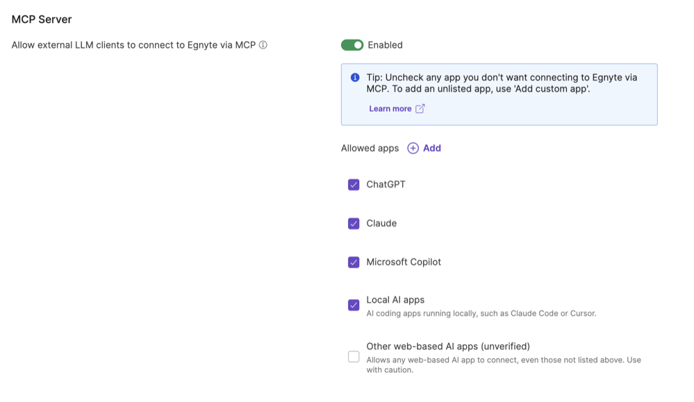 - Enables AI-assisted access to Egnyte content without compromising security or compliance.