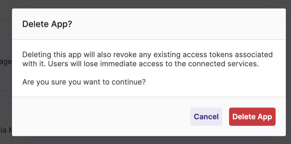 - On clicking the delete icon, the confirmation popup shows up. Click on Delete App to confirm and the custom app will be removed from the list.