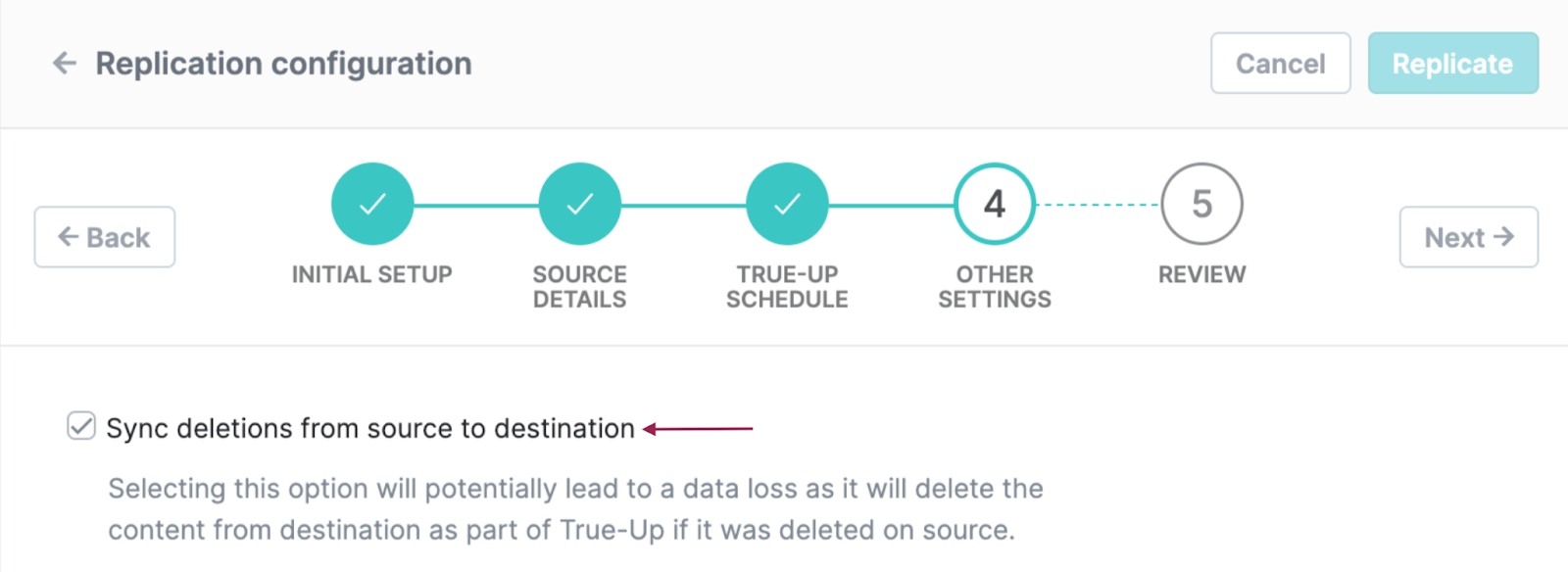 An additional Other Settings step is now added to the Replication Configuration wizard for ONLY AWS S3 and Wasabi destinations. This setting provides the option to enable or disable sync deletions from source to destination and it is unchecked by default.