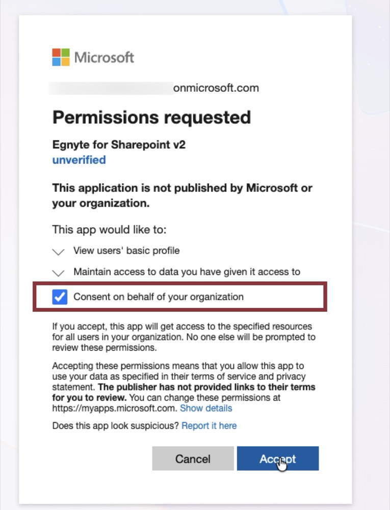- Search for and select the Egnyte for SharePoint v2 app from the dialog.