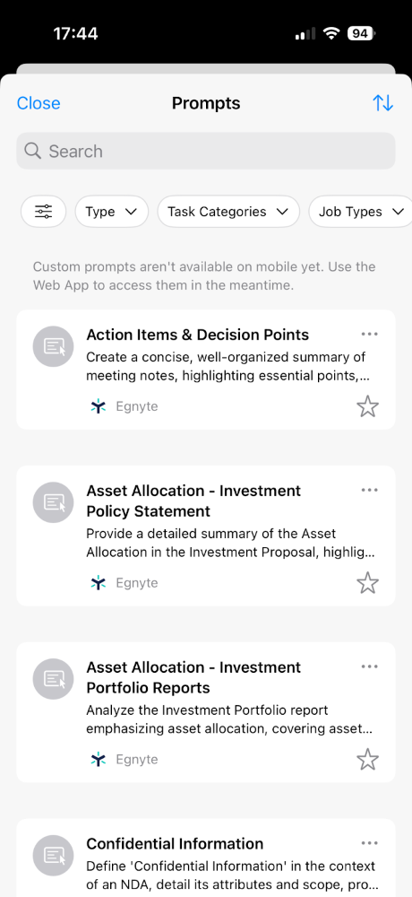 The Prompt Library is now available in the Egnyte iOS for Intune, allowing users to access and insert high-quality, pre-defined prompts directly from the AI Assistant input area. This update enables browsing by categories like Favorites and Trending, as well as filtering by task, job, or document type. Users can also mark specific prompts as favorites for quick access on the go.