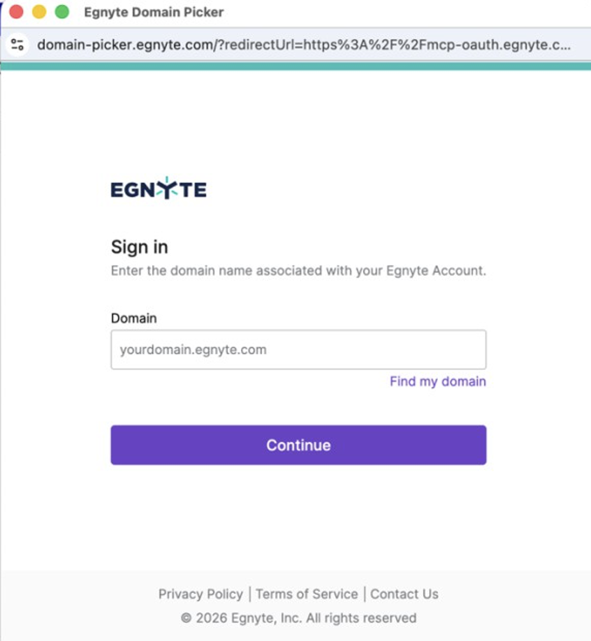 - Server URL: https://mcp-server.egnyte.com/mcp. Refer MCP server documentation for more details.