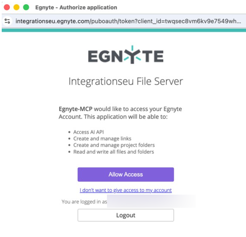 - Click on Allow Access to confirm consent. It is required to use an Egnyte Admin account.