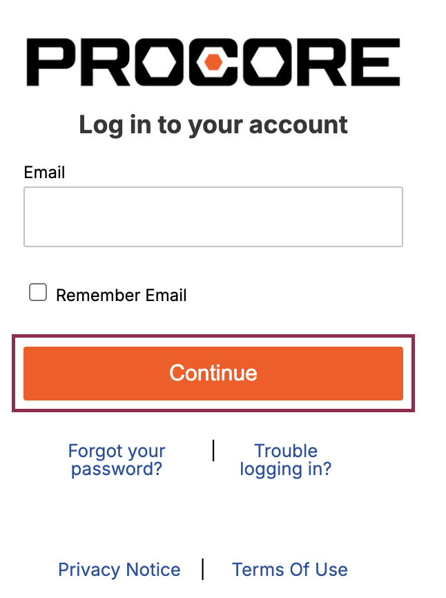 Log in to the Procore account at app.procore.com. Enter the email address and click on Continue.
