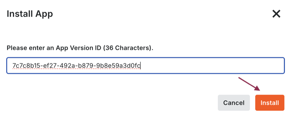- Enter the App Version ID as 7c7c8b15-ef27-492a-b879-9b8e59a3d0fc and click on Install.