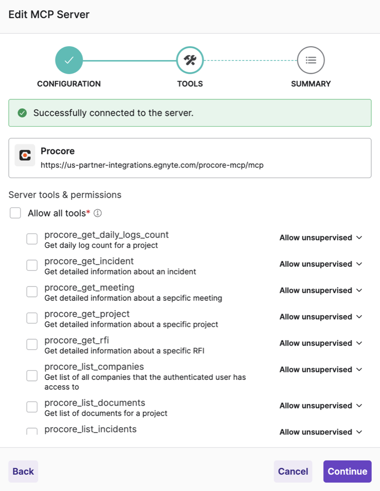 All Procore tools are read-only (list, get, search operations). It is safe to set them to Allow unsupervised since they only retrieve data and do not modify anything in Procore.