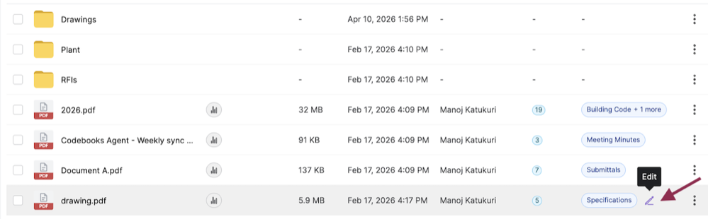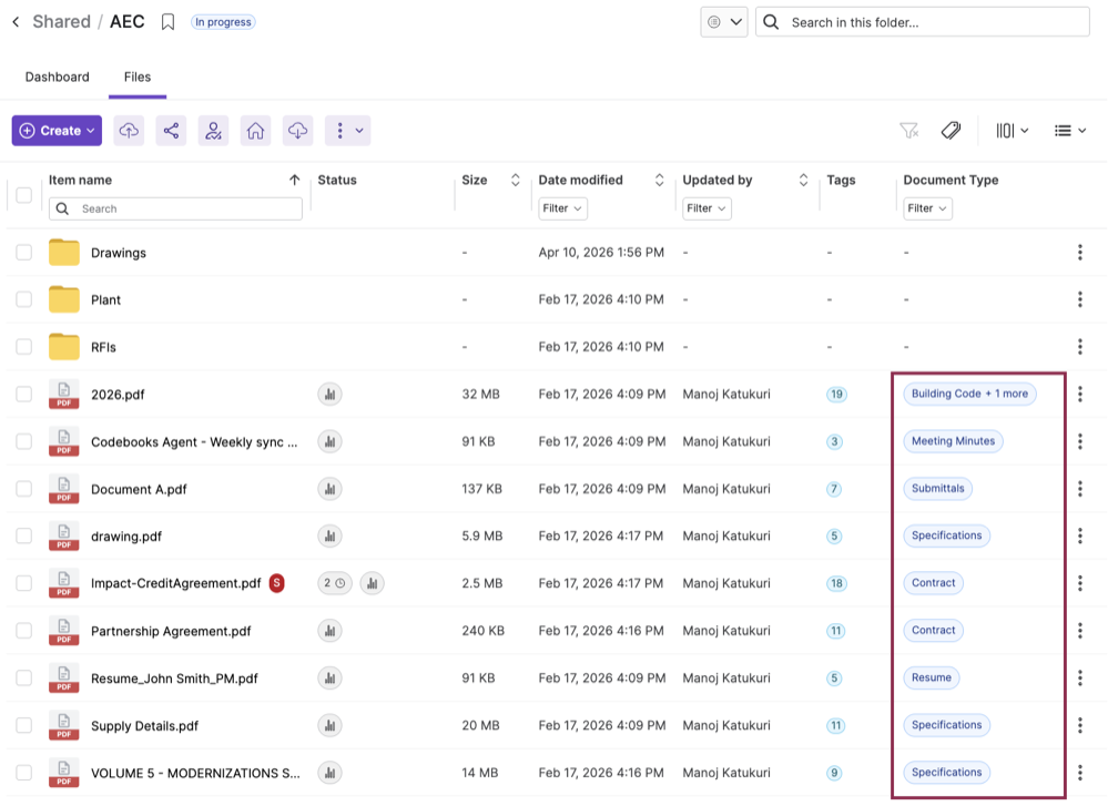 Egnyte auto-identifies document types specific to the Architecture, Engineering, and Construction industry using a Small Language Model (SLM). These document types are saved as tags on the file, enabling a number of downstream workflows such as enhanced retrieval and discovery of content based on document type.