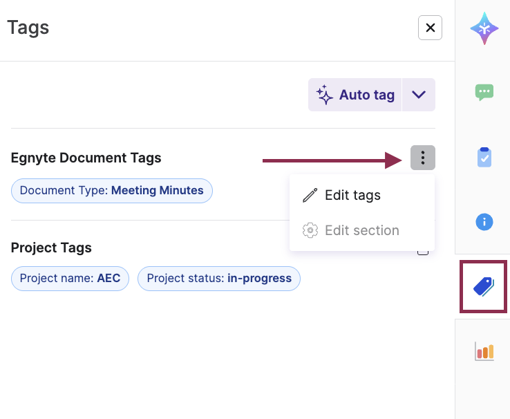 - Egnyte’s AI Assistant - The document tags will be ingested by Egnyte AI and provide context for better retrieval results when using Egnyte’s AI Assistant.